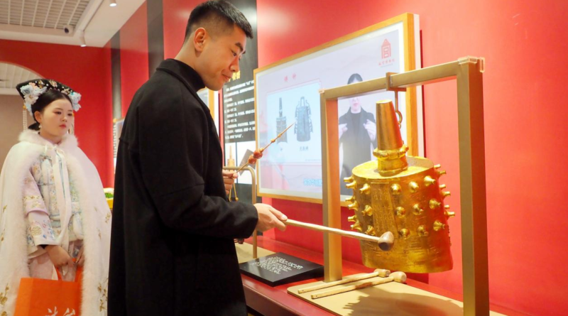 One such example is the Warring States bronze vessel decorated with scenes of feasting, hunting, and battle. Through touchscreens, visitors can animate the ancient figures, watching them pick mulberry leaves, practice archery, enjoy banquets, or wage war by land and water. “Visitors can not only view relics up close, but also hold them virtually in the palm of their hands,” Tie explained.