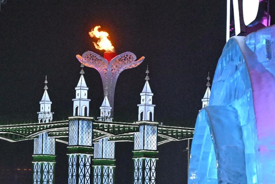The lit cauldron of the 9th Asian Winter Games is pictured at the Harbin Ice-Snow World Park during the opening ceremony of the 9th Asian Winter Games in Harbin, northeast China’s Heilongjiang Province, Feb. 7, 2025. (Photo by Hu Qingming/People’s Daily Online)