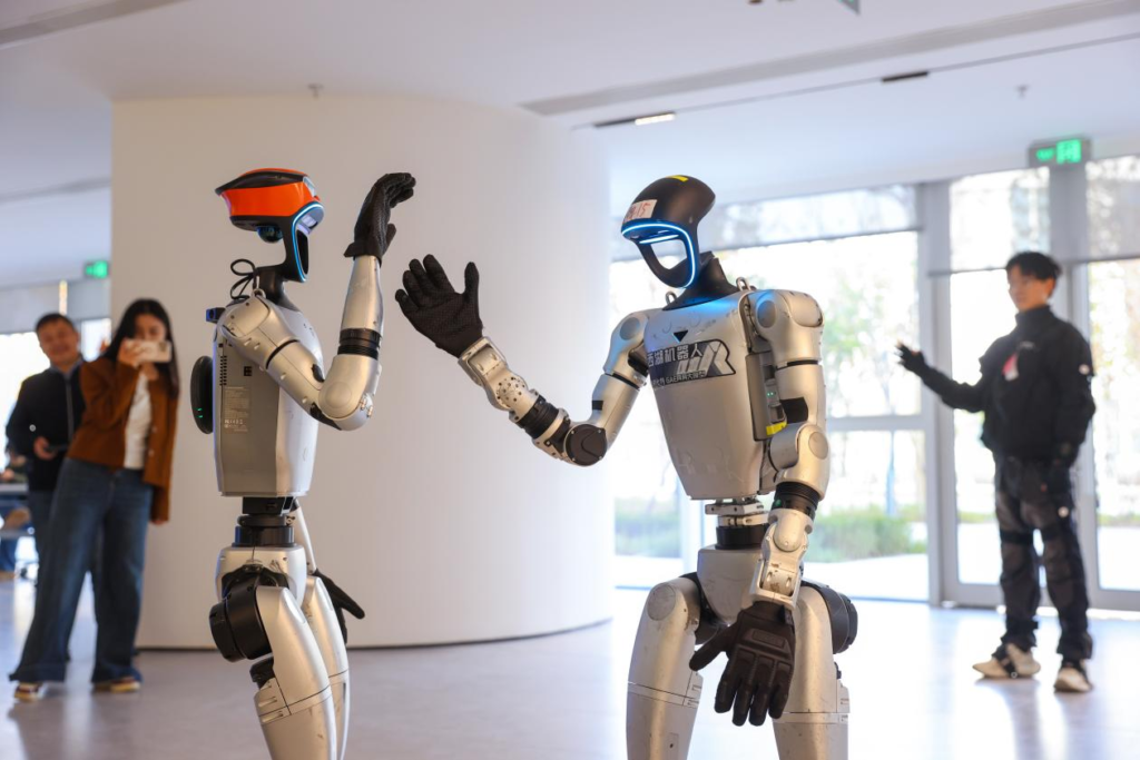Robots are training at a data collection center for embodied artificial intelligence in Deqing, east China’s Zhejiang province. (Photo/Zhao Ning)
